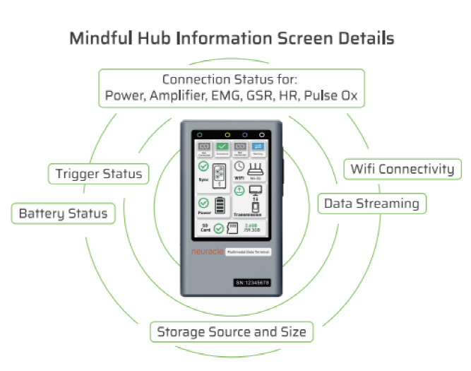 Mindful Hub supports the Mindful Lab, Mindful Stim Lab and Mindful EMG systems. Fully integrated with both the amplifier and trigger module, Mindful Hub provides the ultimate in mobility while providing critical information about devices, connections and data quality.